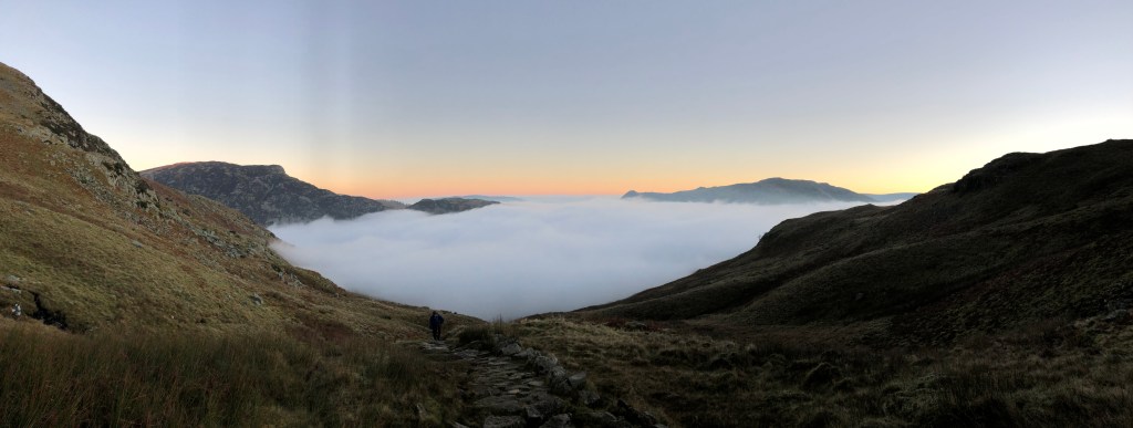 A month or so later we decided to tackle Striding edge on Helvellyn. My fear of heights would be tested to the max but I was determined to push through. We parked in Glenridding and started our walk in the most awful rain and darkness – It looked like it was going to be a slog of a day. Dean kept saying “quick, we need to get higher for the inversion”.