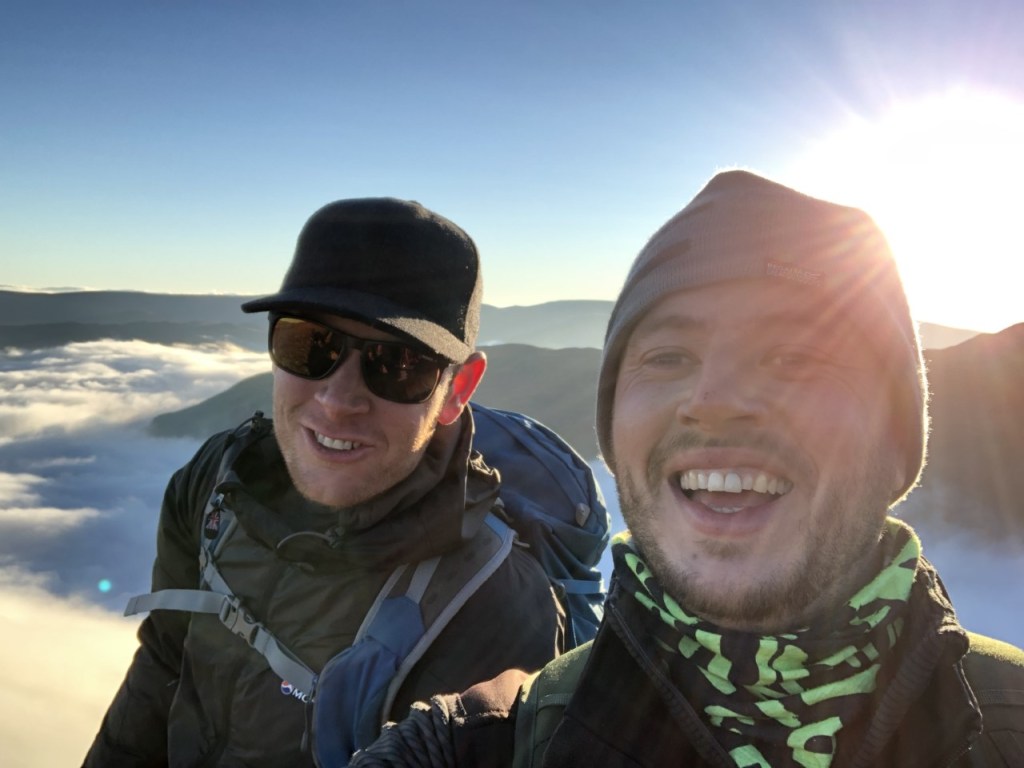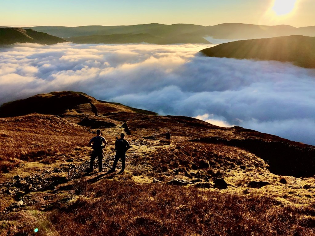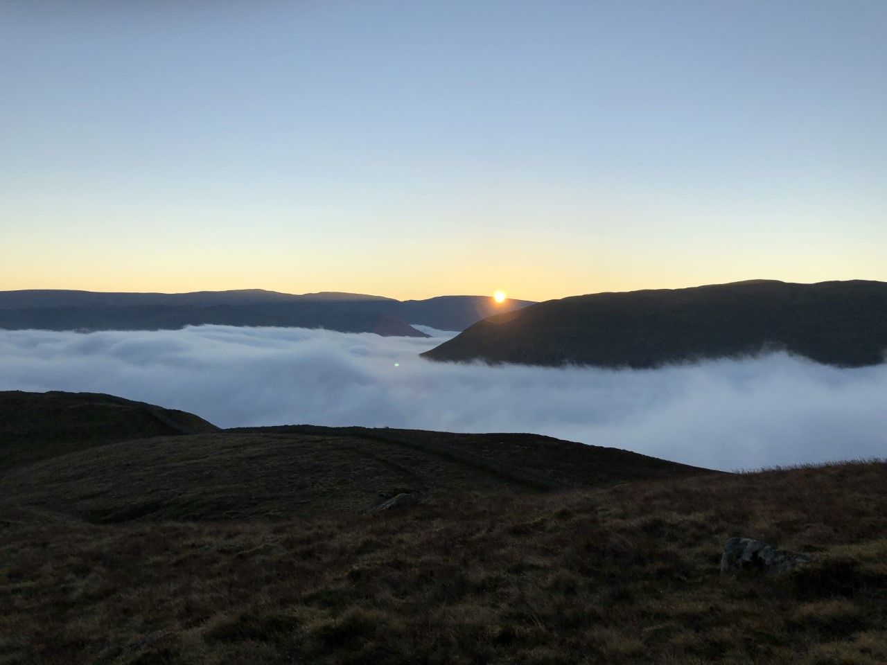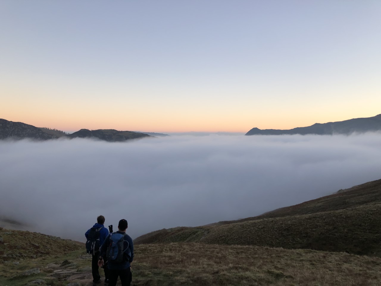 I had no idea what he was talking about but stomping along in the rain with no views and the cloud clagged in, I mustered up the motivation to walk with him and to not slow him down. Out of nowhere the cloud around us disappeared and we had clear skies. We stopped to take in the sunrise and looked back on the route we’d taken and BANG there it was, the most incredible cloud inversion you could ever wish to see!