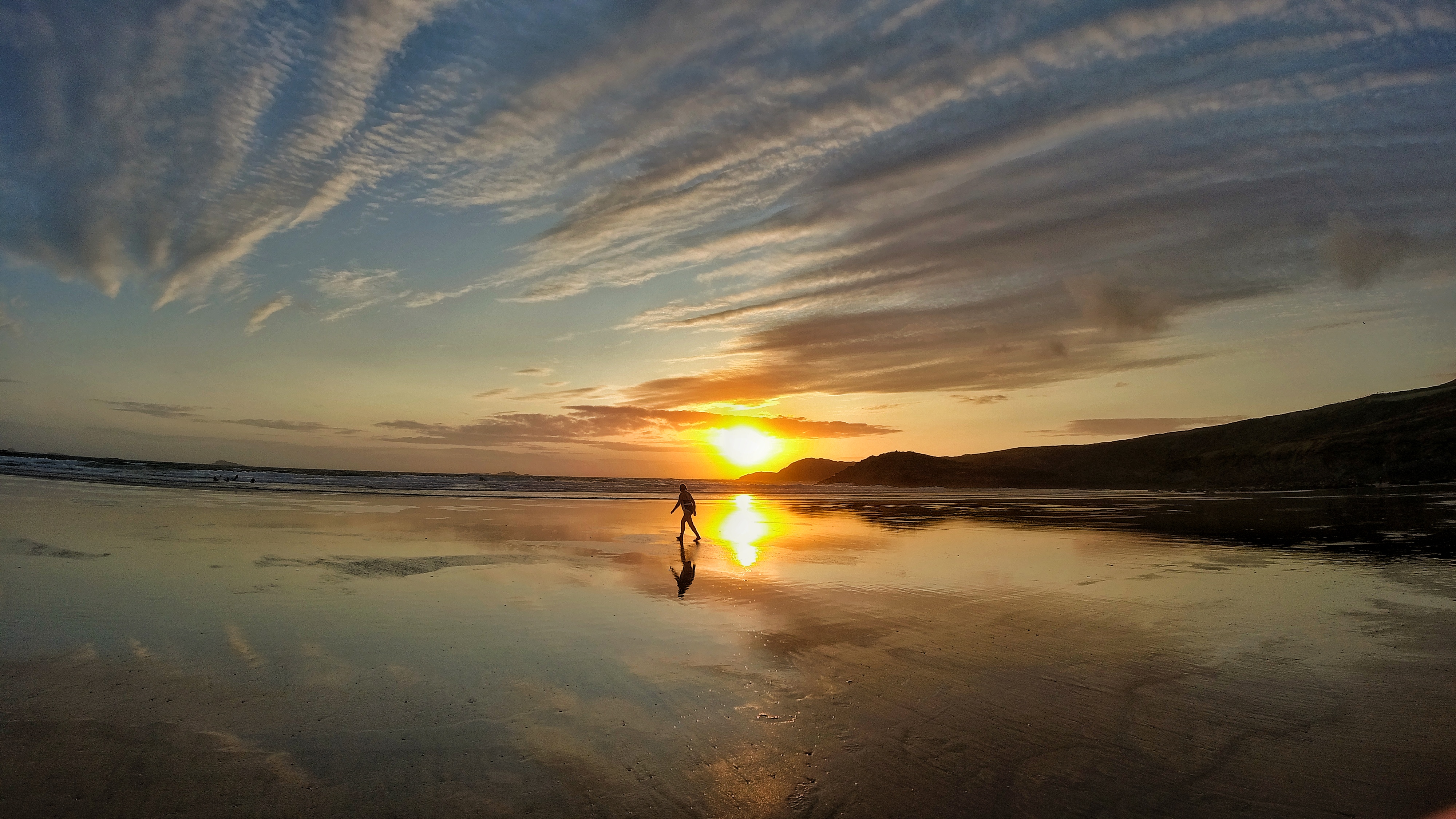 We arrived with some time to get out for a walk along the sand and to watch the surfers getting the last bit of fun in whilst the light was still good. There were surprisingly few people there but the rocks above and all along to St David’s Head were peppered with silhouettes of fellow sunset enthusiasts. As tradition has it, maybe just my tradition, whenever you go to the beach, whatever the time of day, whatever the weather or the occasion, you need to touch the sea and we walked out to water to fulfil this duty, the remaining wash on the wet sand perfectly reflected sky like a mirror.